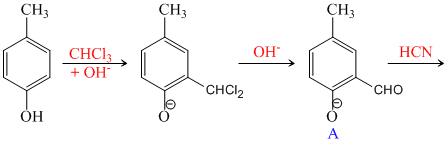 p-cresol reacts with chloroform in alkaline medium to give the compound A which adds hydrogen cyanide to form, the compound B. The latter on acidic hydrolysis gives chiral carboxylic acid. The structure of the carboxylic acid is