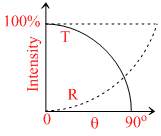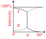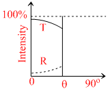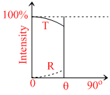 A light ray travelling in glass medium is incident on glass-air interface at an angle of incidence θ. The reflected (R) and transmitted (T) intensities, both as function of q, are plotted. The correct sketch is