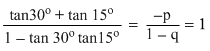 If the roots of the quadratic equation x2 + px + q = 0 are tan30o and tan15o, respectively then the value of 2 + q - p is