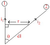 Wires 1 and 2 carrying currents i1 and i2 respectively are inclined at an angle θ to each other. What is the force on a small element dI of wire 2 at a distance of r from wire 1 (as shown in the figure) due to the magnetic field of wire 1?