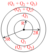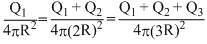 Three concentric metallic spherical shells of radii R, 2R, 3R, are given charges Q1, Q2, Q3, respectively. It is-found that the surface charge densities on the outer surfaces of the shells are equal. Then, the ratio of the charges given to the shells, Q1 : Q2 : Q3, is