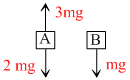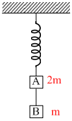 Two blocks A and B of masses 2m and m, respectively, are connected by a massless and inextensible string. The whole system is suspended by a massless spring as shown in the figure. The magnitudes of acceleration of A and B, immediately after the string is cut, are respectively
