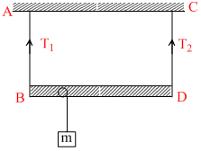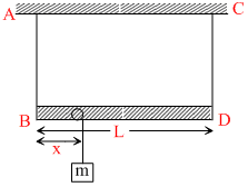 A massless rod is suspended by two identical strings AB and CD of equal length. A block of mass m is suspended from point O such that BO is equal to ′x′. Further, it is observed that the frequency of 1st harmonic (fundamental frequency) in AB is equal to 2nd harmonic frequency in CD. Then, length of BO is