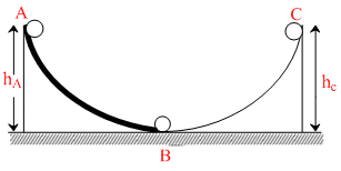 A ball moves over a fixed track as shown in the figure. From A to B the ball rolls without slipping. Surface BC is frictionless. KA, KB and KC are kinetic energies of the ball at A, B and C, respectively. Then
