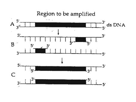 The figure below shows three steps (A, B, C) of Polymerase Chain Reaction (PCR). Select theoption giving correct identification together with what it represents ?