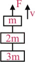 Three blocks with masses m, 2m and 3m are connected by strings,as shown in the figure. After an upward force F is applied on block m, the masses move upward at constant speed v. What is the net force on the block of mass 2m ? (g is the acceleration due to gravity)