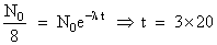 The half life of a radioactive isotope ′X′ is 20 years. It decays to another element ′Y′ which is stable. The two elements ′X′ and ′Y′ were found to be in the ratio 1 : 7 in a sample of a given rock. The age of the rock is estimated to be: