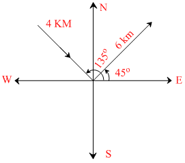 A car travels 6km towards north at an angle of 45o to the east and them travels distance of 4km towards north at an angle 135o to east. How far is the point from the starting point? What angle does the straight line joining its initial and final position makes with the east?