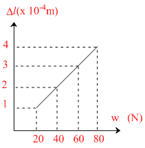 The adjacent graph shows the extension (ᐃl)of a wire of length 1m supemded from the top of a roof at one end and with a load W connected to the other end. If the cross-sectional area of the wire is 10-6 m2, calculate the young′s modulus of the material of the wire.