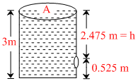 Water is filled in a container upto heigh of 3m. A small hole of area ′A0′ is punched in the wall of the container at a height 52.5 cm from the bottom. The cross sectional area of the container is A. If A0 /A = 0.1 then v2 is (where v is the velocity of water coming out of the hole)