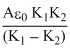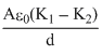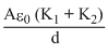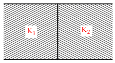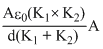 Two materials having the dielectric constants K1 and K2 are filled between two parallel plates of a capacitor, Whichj is show in figure. The capcity of the capacitor is :