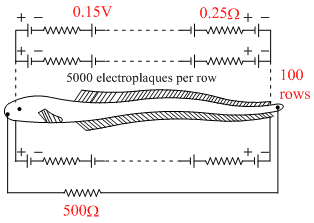 Eels are able to generate current with biological cells called electroplaques . Theelectroplaques The electroplaques is an eel are arranged in 100 rows, aech row stretching horizontally along the body of the fish containing 5000 electroplaques . The arrangement is suggestively shown below. Each electroplaques has an emf of 0.15V and internal resistance of 0.25Ω. The water surrounding the eel completes a circuit between the head and its tail. if the water surrounding it has a resistance of 500Ω, The current an eel can produce in water is about :