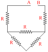 What is the equivalent resistance across A and B in the figure shown, if R = 3Ω?