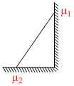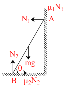In the figure, a ladder of mass m is shown leaning against a wall. It is in static equilibrium making an angle θ with the horizontal floor. The coefficient of friction between the wall and the ladder is μ1 and that between the floor and the ladder is μ2, The normal reaction of the wall on the ladder is N1 and that of the floor is N2 If the ladder is about to slip, then