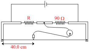 During an experiment with a metre bridge, the galvanometer shows a null point when the jockey is pressed at 40.0 cm using a standard resistance of 90 Ω, as shown in the figure. The least count of the scale used in the metre bridge is 1 mm. The unknown resistance is