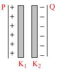 Two thin dielectric slabs of dielectric constants K2 and K2 (K1 < K2) are inserted between plates of a parallel plate capacitor, as shown in the figure. The variation of electric field E between the plates with distance d as measured from plate P is correctly shown by