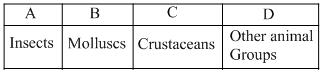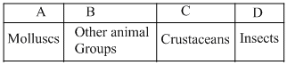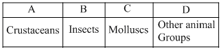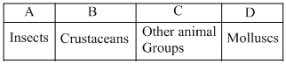 Given below is the representation of the extent of global diversity of invertebrates. What groups the four portions (A-D) represent respectively?