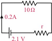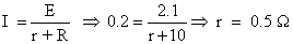 The internal resistance of a 2.1 V cell which gives a current of 0.2 A through a resistance of 10 Ω is