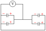 The four capacitors, each of 25μF are connected as shown in Fig. The dc voltmeter reads 200 V. The charge on each plate of capacitor is