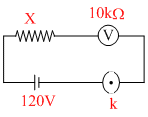 A D.C. supply of 120 V is connected to a large resistance X. A voltmeter of resistance 10kΩ placed in series in the circuit reads 4V. This is an unusual use of voltmeter for measuring very high resistance. The value of X is :