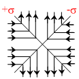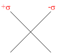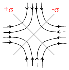 Two infinite sheets carrying charge density + σ and -σ are arranged perpendicularly as shown in the figure. Select the approximate electric field lines for the charge system near the intersection.