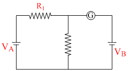 In the circuit shown the cells A and B have negligible resistances. For VA = 12V, R1 = 500 Ω and R =100 Ω the galvanometer (G) shows no deflection. The value of VB is