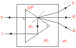 A right angled prism of refractive index μ1 is placed in a rectangular block of refractive index μ2, whichis surrounded by a medium of refractive index μ3, as shown in the figure. A ray of light ′e′ entersthe rectangular block at normal incidence. Depending upon the relationships between μ1, μ2, and μ3,it takes one of the four possible paths ′ef′, ′eg′, ′eh′ or ′ei′.