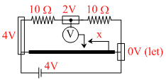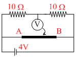 In the adjacent circuit, AB is a potentiometer wire of length 40 cm and resistance per unit length 50Ω/m. As shown in the figure, the free end of an ideal voltmeter is touching the potentiometer wire. What should be the velocity of the jockey as a function of time so that reading in the voltmeter varies with time as (2 sin πt) ?