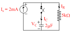 Consider a circuit with a constant current source of IC = 2mA with a capacitor of 2μF and resistor of 5kΩ (as shown in figure). At t = 0 the switch is closed. IC & IR denotes current in the capacitor & resistor branch respectively and VC represents potential difference across the capacitor. Choose the correct graph(s).