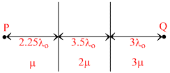 An electromagnetic wave of wavelength λo (in vacuum) passes from P towards Q crossing three different media of refractive index μ, 2μ and 3μ respectively as shown in figure. φP and φQ be the phase of the wave at points P and Q. Find the phase difference φQ - φP. [Take : μ = 1]