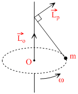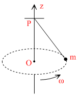 A small mass m is attached to a massless string whose other end is fixed at P as shown in the figure. The mass is undergoing circular motion in the x-y plane with centre at O and constant angular speed ω. If the angular momentum of the system, calculated about O and P are denoted by