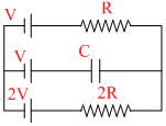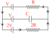 For the upper loop, V - VC - iR - V = 0 ⇒ |VC| = iR = V/3