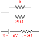 An electric circuit consists of a battery emf E = 110 V, and internal resistance is 5Ω and two resistors connected in parallel to the source as shown in figure. Determine the value of R so that maximum power get dissipated in resistance R.