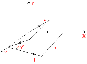 Find the magnetic dipole moment of the rectangular loop shown in the figure. Sides, a = 3m, b = 4m and c = 2m, current in the loop I = 1 Amp