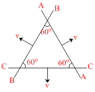 Three long rods AA, BB, CC are moving with a speed v in a uniform magnetic field B as shown in the figure. The triangle formed between the three wires is always an equilateral triangle. The induced current in the triangle is (resistance per unit length of wire is λ) : -