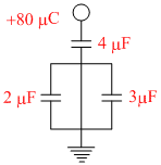 In the given circuit, a charge of +80 μC is given to the upper plate of the 4 μF capacitor. Then inthe steady state, the charge on the upper plate of the 3 μF capacitor is