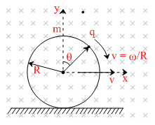 A ring of mass m and radius R is set into pure rolling on horizontal rough surface, in a uniform magnetic field of strength B as shown in the figure. A point charge q of negligible mass is attached to rolling ring. Friction is sufficient so that it does not slip at any point of its motion. (θ is measured in clockwise from positive y-axis) :-