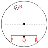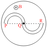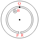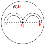 In each of the following diagrams, the magnetic field in the circular region is inside the plane of the paper and is increasing with time. Four different shaped metallic conductors ′PQR′ are placed as shown. The end P will be more positively charged compared to R in : (Q is the center in options AB).