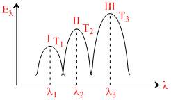 Three identical bodies are at temperature T1, T2 and T3 having e1, e2 and e3 as their respective emissivities. The thermal spectrum obtained for them is as shown in the diagram. Choose the correct order of temperatures and emissivities:-